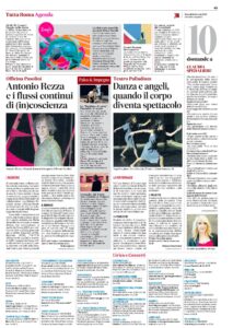 La composizione si sviluppa così tra rigore e imprevedibilità, in un equilibrio instabile che, quasi in filigrana, può lasciare affiorare una dimensione altra, forse angelica, affidata esclusivamente alla potenza del gesto e alla centralità dell’umano in scena.