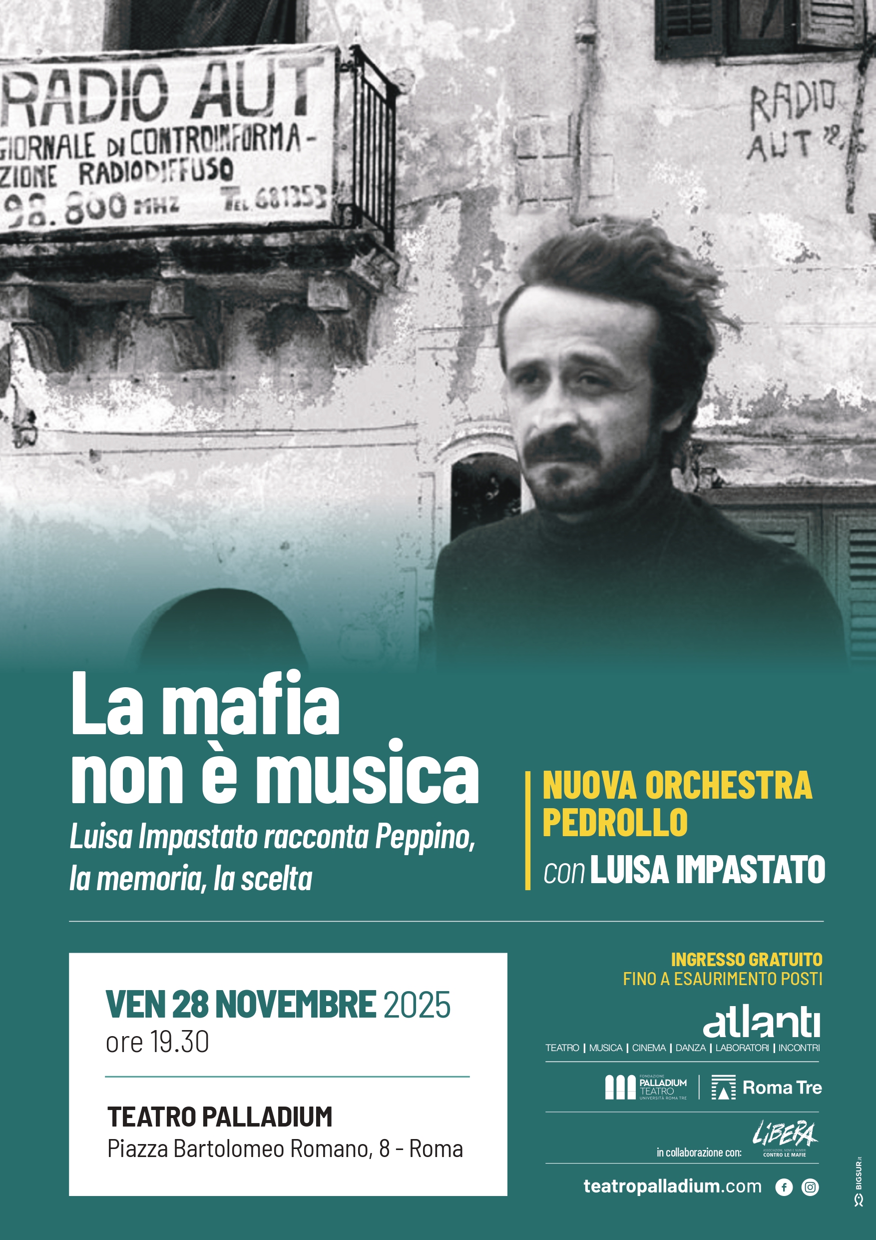Evento performativo e di impegno civile dedicato alla figura di Peppino Impastato, alla memoria e alla scelta della legalità. Attraverso il racconto di Luisa Impastato e l’intervento musicale della Nuova Orchestra Pedrollo, la serata intreccia parola e musica per riflettere sul valore della testimonianza, della memoria storica e del contrasto culturale alla mafia. L’iniziativa si inserisce all’interno delle attività di divulgazione culturale e civile promosse dal Teatro Palladium.