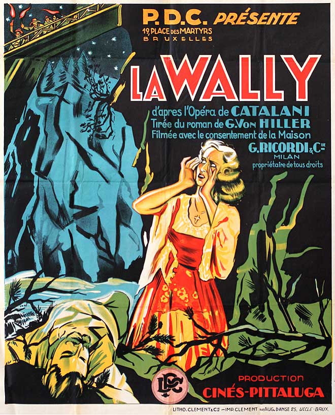 Film musicale basato sull’opera lirica omonima di Alfredo Catalani. Wally è una ragazza tirolese virtuosa. Ama Hagenbach ma quando lui la bacia forzatamente, offesa, fugge dal paese e sale verso la montagna. Il ragazzo la insegue con l’intenzione di chiedere perdono ma viene travolto da una valanga. Anche la ragazza morirà.