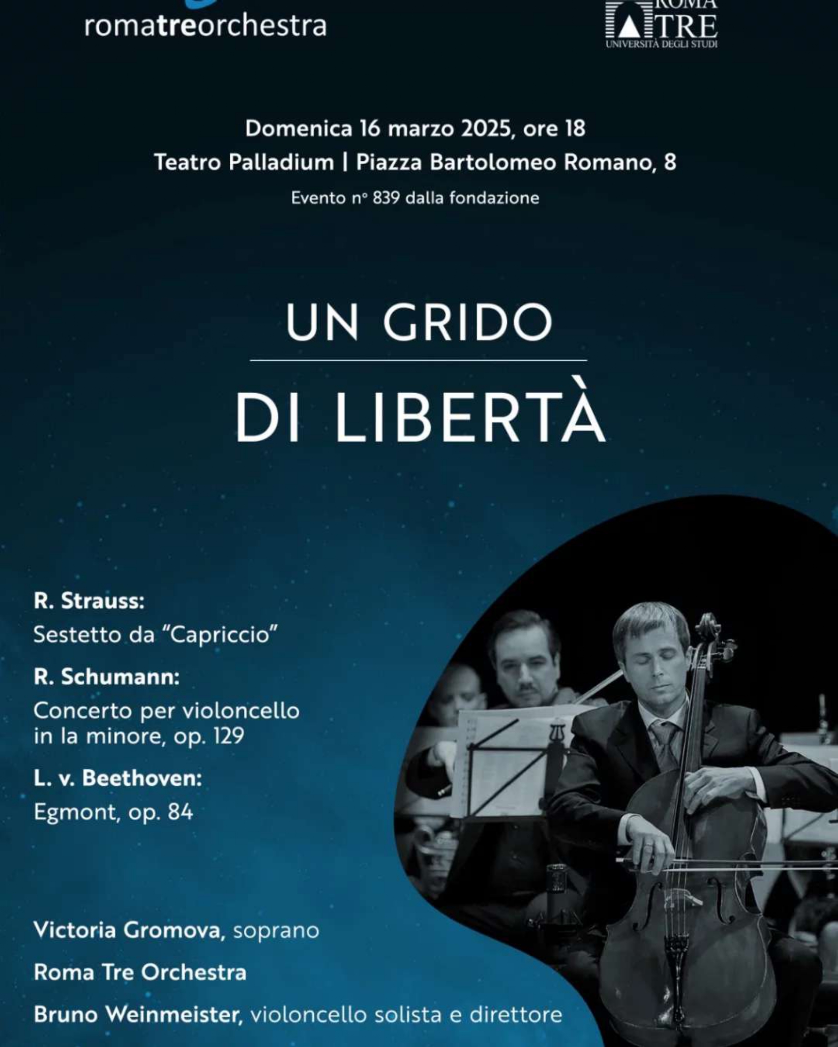 Un grido di libertà è un concerto eseguito dalla Roma Tre Orchestra, che propone un programma interamente dedicato a questo tema. In scaletta figurano il Sestetto tratto da Capriccio di Richard Strauss, il Concerto per violoncello in la minore op. 129 di Robert Schumann ed Egmont op. 84 di Ludwig van Beethoven. A guidare e interpretare la serata sono il soprano Victoria Gromova e Bruno Weinmeister, violoncellista solista e direttore, insieme all’orchestra, in un percorso musicale che esplora il significato della libertà attraverso pagine diverse per stile ed epoca.